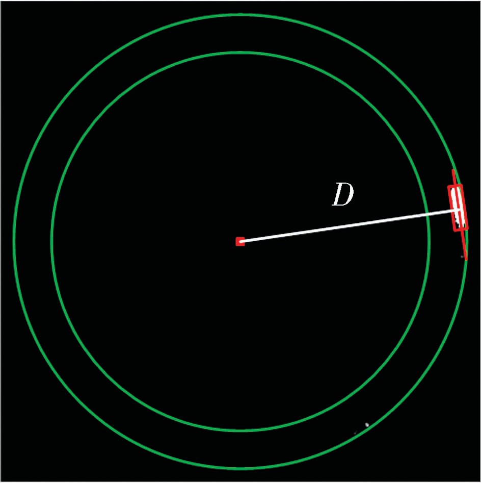 提取出缺陷后,計(jì)算該缺陷的區(qū)域面積S與區(qū)域輪廓長(zhǎng)度L,如果缺陷面積與輪廓長(zhǎng)度皆未超過(guò)設(shè)定閾值,則視為無(wú)此類型缺陷轉(zhuǎn)而進(jìn)行下一缺陷的識(shí)別;否則進(jìn)一步計(jì)算最小外接矩形主軸至小圓圓心的距離,由于車廢細(xì)化后呈圓弧形,故圓心至主軸的距離會(huì)大于小圓半徑,所以將小圓半徑設(shè)為距離閾值TD,若距離D超過(guò)閾值TD,則將此套圈判定為車廢缺陷。